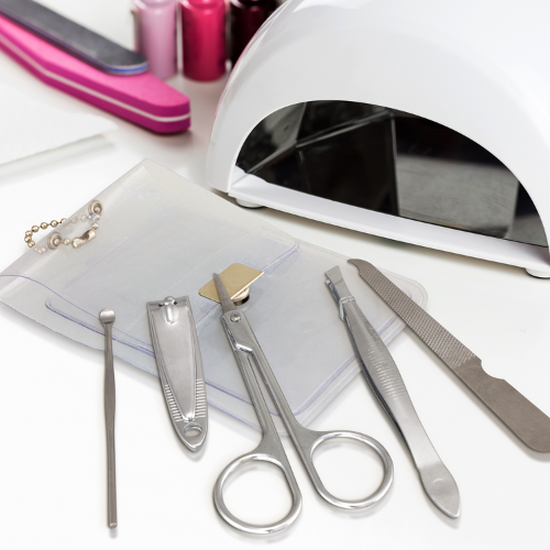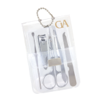 Translucent vinyl manicure set which includes scissors, nail clippers, a cuticle pusher, a nail file and a set of tweezers. Branding is on the vinyl pouch which has a snap closure and a chain for hanging or attaching the set as needed.