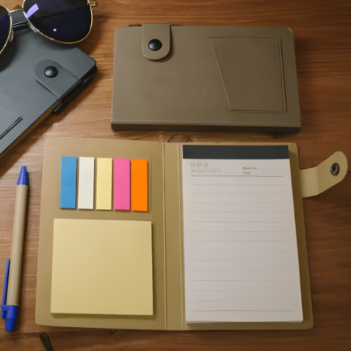 Sustainably designed for modern professionals, this Eco-Friendly PU Leather & Kraft Cover Notebook Set blends style with responsibility. Made from eco-conscious PU leather and recyclable kraft materials, it offers a refined look with minimal environmental impact. The set includes a lined notebook, colorful sticky notes for quick organization, and a matching pen for everyday convenience. Perfect for work, school, or gifting, it’s a practical stationery companion that reflects both functionality and eco-friendly values.